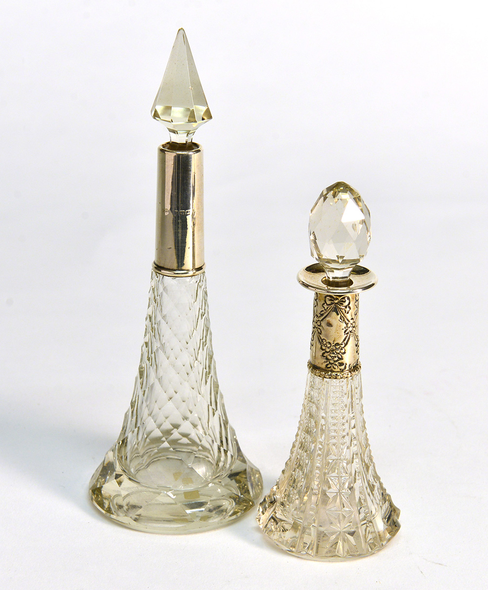 Lotto di due bottiglie in vetro con collo in metallo e argento