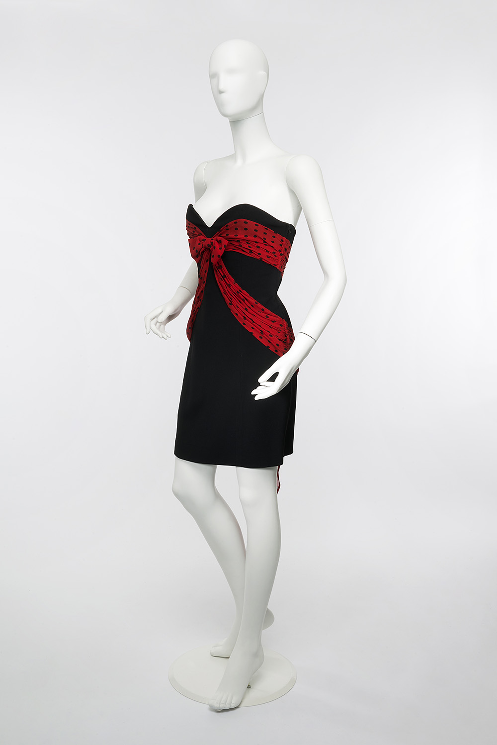 Moschino Couture: abito cocktail nero con finiture georgette rosse a pois neri a creare un fiocco sul retro, tg 44 (lievi difetti) Moschino Couture: black cocktail dress (size 44) (defects)
