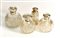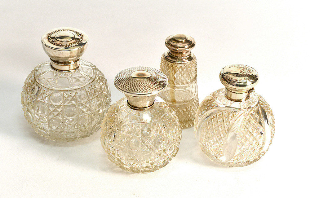 Lotto di quattro bottiglie in vetro ialino molato e inciso misure a forme diverse con tappo in argento