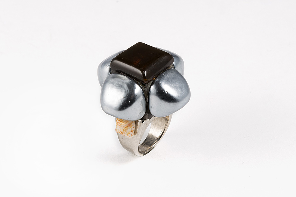PAOLO BELLINI Anello in metallo nichelato con perle fancy grigie a bottone a contornare una galalite brown