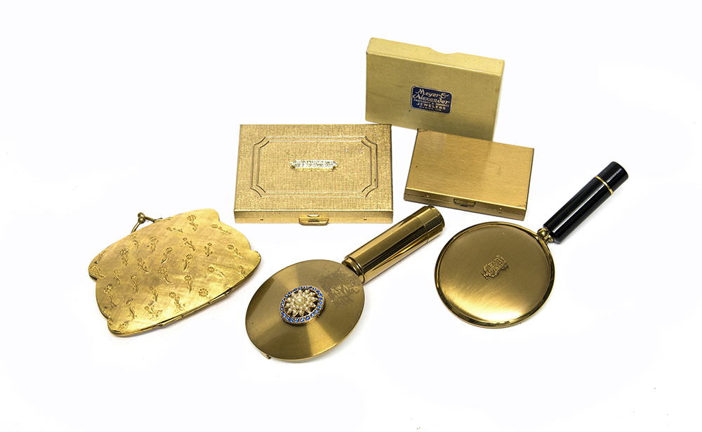 MAX FACTOR, MEYER & ALEXANDER E ANONIMI Lotto di due porta rossetto, un vanity case e due porta rossetto con specchio, tutti in metallo color oro lucido e satinato alcuni rifiniti con strass e perle fancy MAX FACTOR, MEYER & ALEXANDER E ANONIMI Lotto di due porta rossetto, un vanity case e due porta rossetto con specchio, tutti in metallo color oro lucido e satinato alcuni rifiniti con strass e perle fancy Lot comprising two lipstick holders, a compact and a lipstick holder with mirror