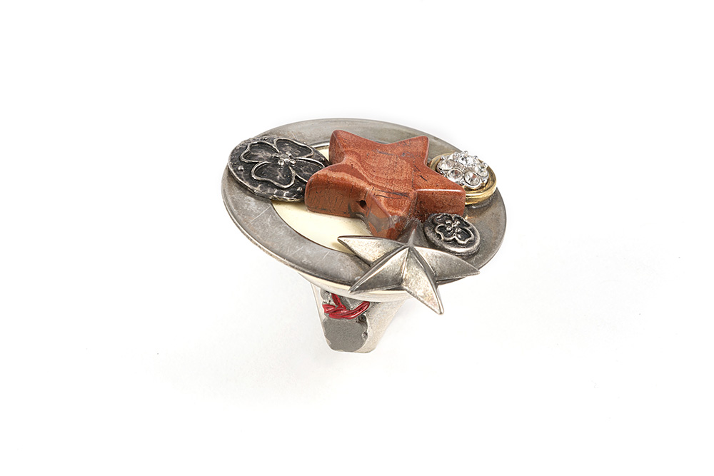 PAOLO BELLINI Anello in metallo color argento rifinito con strass e galalite color avorio e mattone