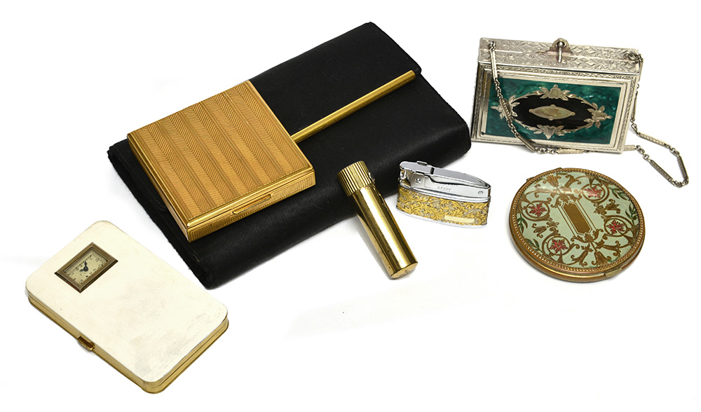 EVANS ñ Lotto di quattro tra portacipria e vanity cases, uno in astuccio di faille nero, in metallo di varie colorazioni rifiniti con smalti ed incisioni, uno con orologio (lievi difetti) EVANS ñ Lotto di quattro tra portacipria e vanity cases, uno in astuccio di faille nero, in metallo di varie colorazioni rifiniti con smalti ed incisioni, uno con orologio (lievi difetti) Lot comprising four compacts of which one with a fitted faille bag and one with watch