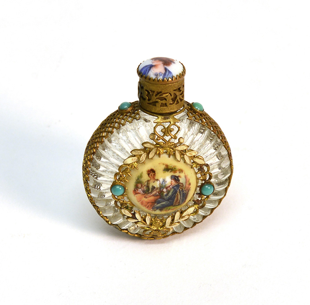 Boccetta porta profumo in vetro e smalti decorata con scena galante, tappo...