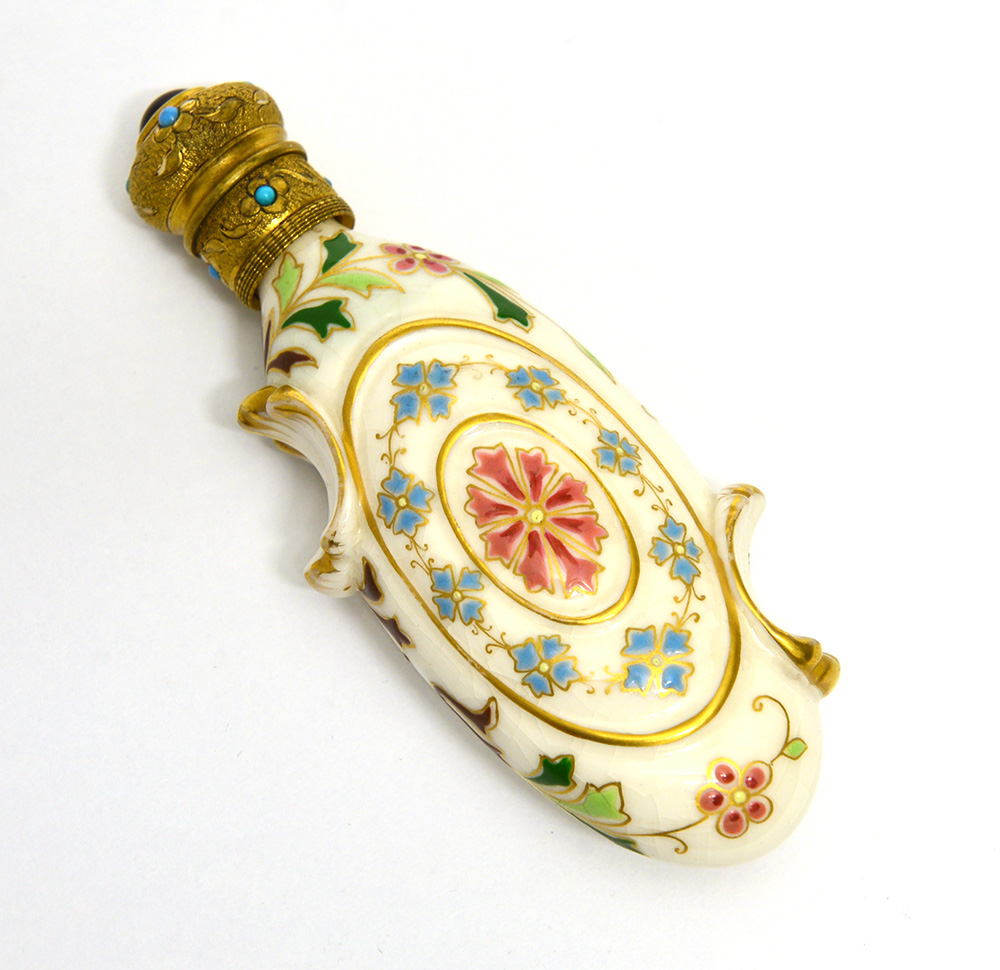 Portaprofumo in ceramica lavorata a rilievo con fiori, tappo in metallo decorato a finte pietre preziose