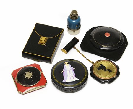 JACQUES FATH, VALAZE E ANONIMI Lotto di cinque portacipria di cui uno con rossetto e una snuff bottle di forme, materiali e dimensioni differenti con rifiniture in smalto (lievi difetti) JACQUES FATH, VALAZE E ANONIMI Lotto di cinque portacipria di cui uno con rossetto e una snuff bottle di forme, materiali e dimensioni differenti con rifiniture in smalto (lievi difetti) Lot comprising five compacts and a snuff bottle (minor defects)