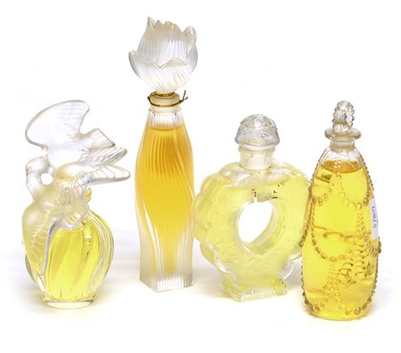 LALIQUE ñ Lotto di quattro bottiglie portaprofumo in vetro di diverse epoche (difetti)