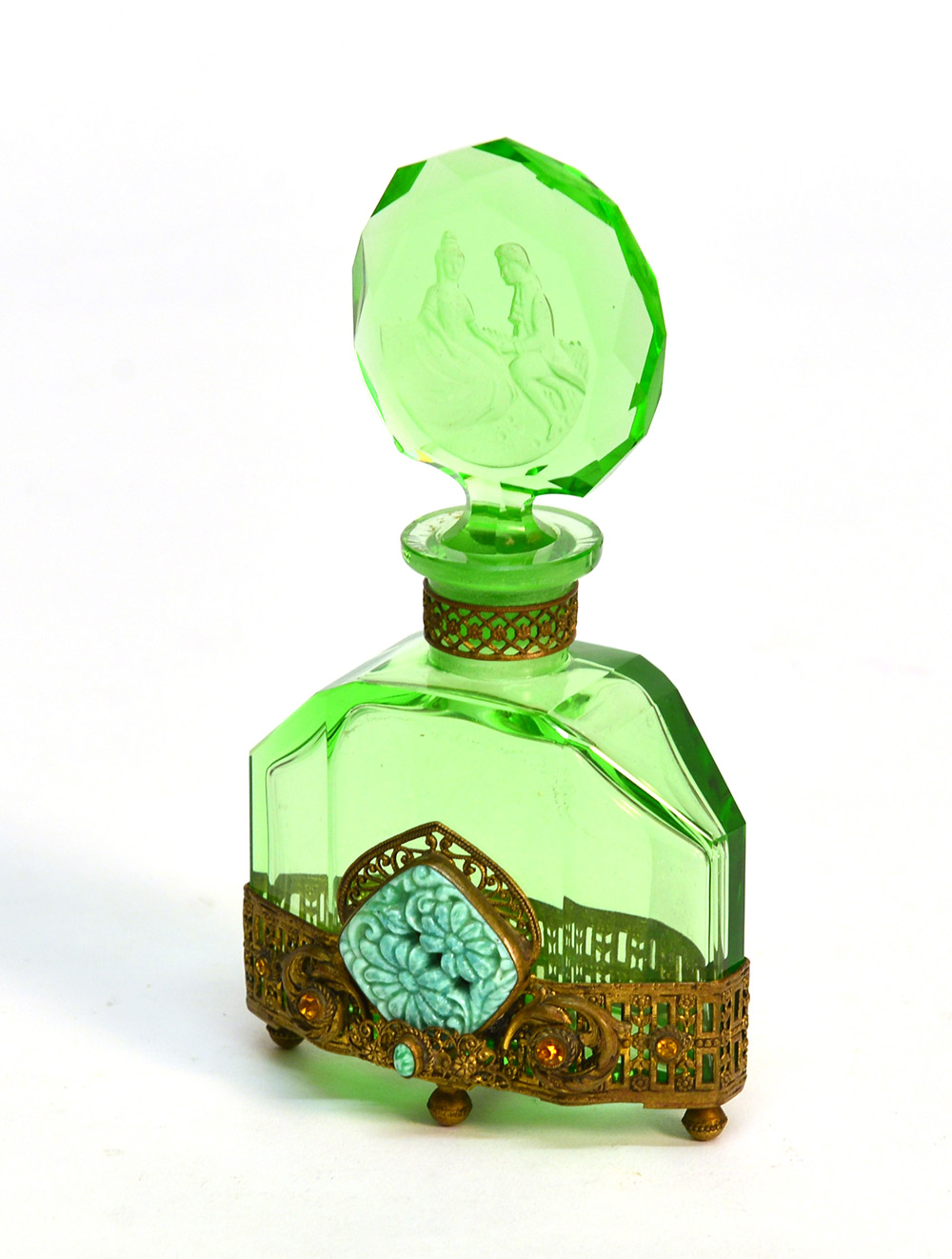 Manifattura cecoslovacca bottiglia portaprofumo in cristallo a fondo verde con tappo decorato all'acido a scena galante. Base e ghiera in metalle dorato e decorato con applicazioni in vetro e in ceramica (h. cm. 16)