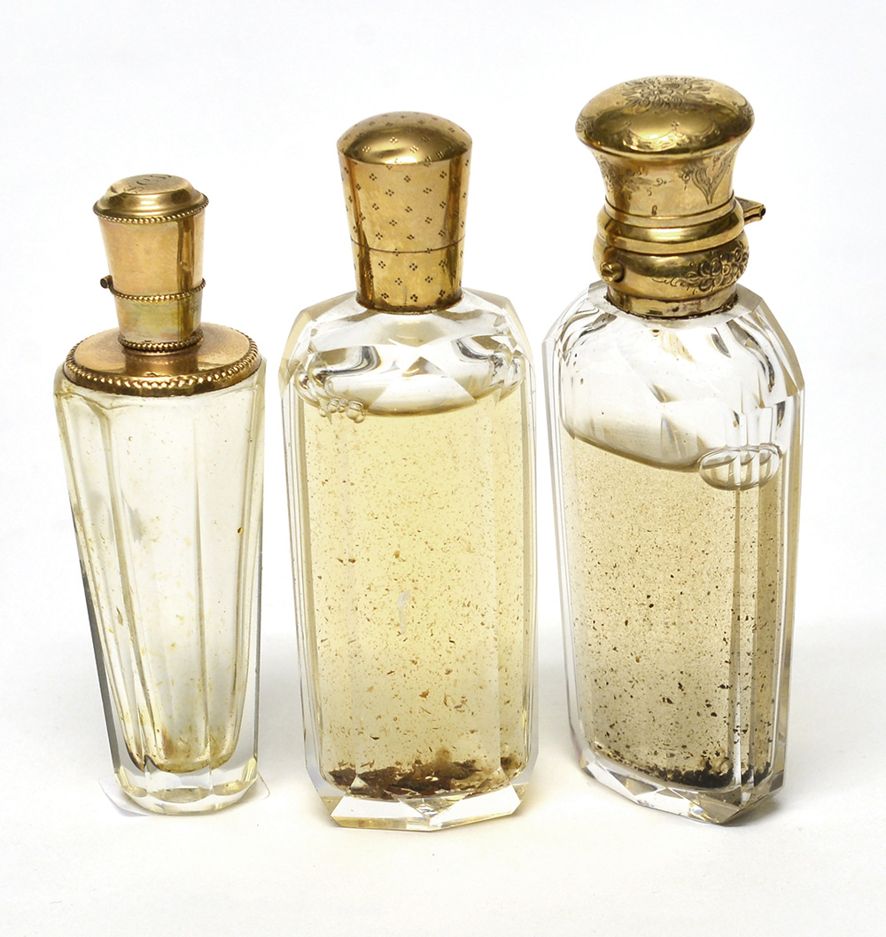 Manifatture diverse. Lotto di tre boccette portaprofumo in vetro e cristallo con ghiere e tappi in oro basso. Fine sec. XIX (lievi difetti)