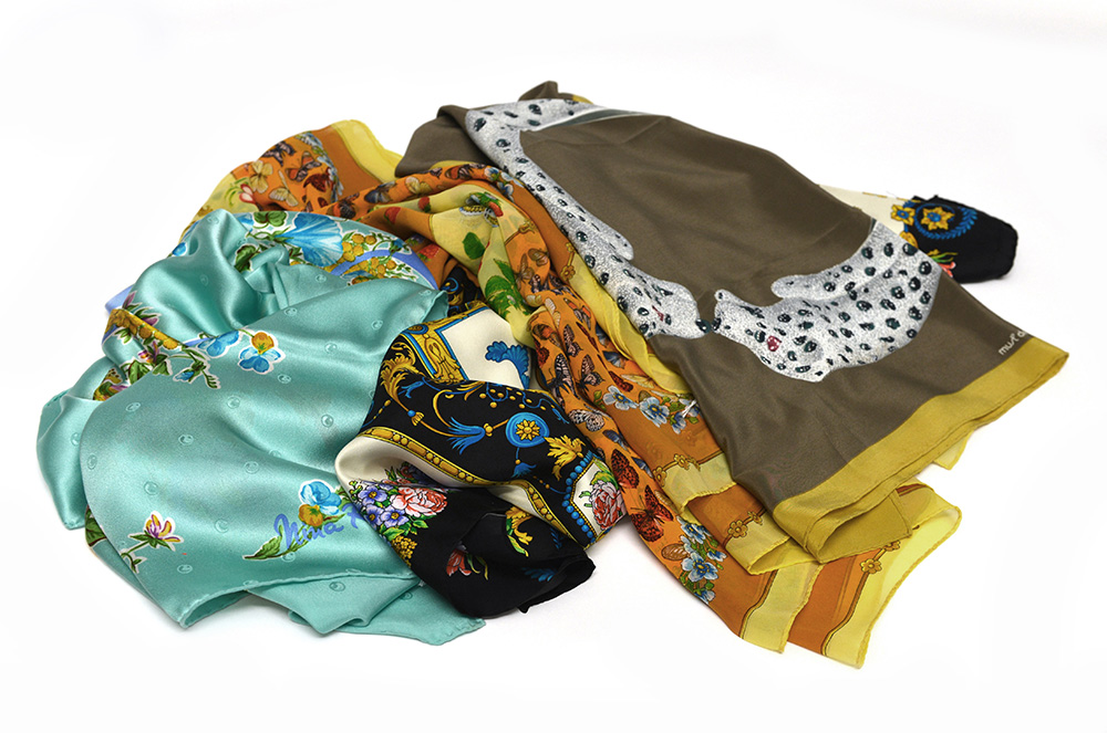 NINA RICCI, LES MUST DE CARTIER, VERSACE Lotto composto da quattro foulards in seta e chiffon di diversi colori e dimensioni (difetti)