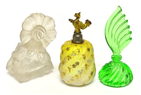 Lotto composto da tre bottiglie portaprofumo di cui una con vaporizzatore di forme ed epoche diverse in vetro e opaline