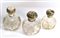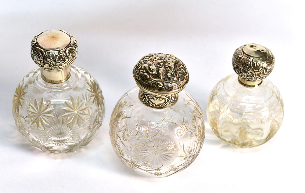 Lotto di tre bottiglie a boule in cristallo ialino inciso con tappo in argento sbalzato diverse dimensioni