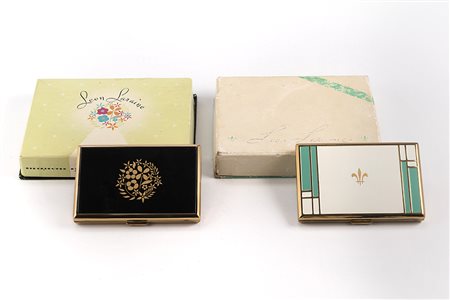 LEON LORAINE ñ Lotto di due vanity cases in metallo color oro e smalti, entrambe con confezioni originali, una con dedica scritta a mano all'interno della confezione LEON LORAINE ñ Lotto di due vanity cases in metallo color oro e smalti, entrambe con confezioni originali, una con dedica scritta a mano all'interno della confezione Lot comprising two gold coloured and enamel compacts