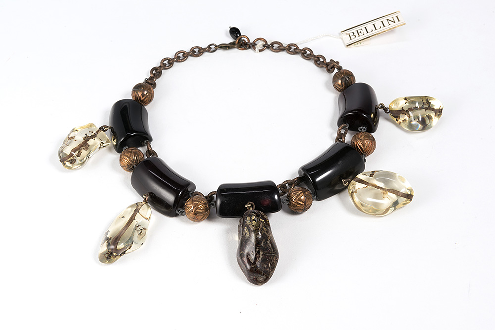 PAOLO BELLINI Collier in catena metallica brunita con elementi in galalite nera e charms trasparenti