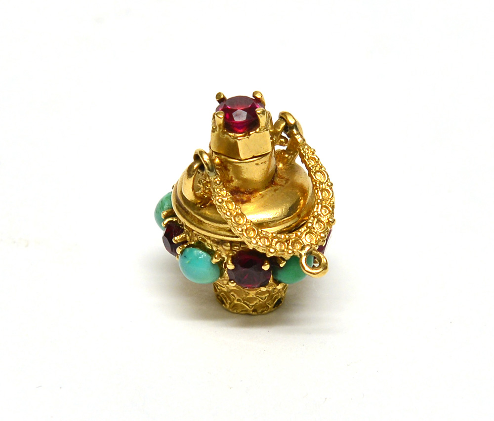 Portaprofumo/pendente in oro 14k decorato con turchesi e vetri artificiali, a forma di cestino, h cm 3