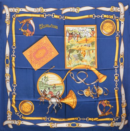 HERMES Foulard in seta "Trompe de Chasse", Henri de Linares su fondo blu...