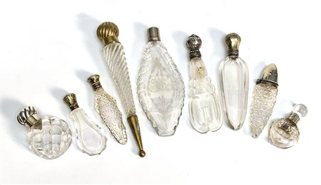 Lotto di nove boccettine in vetro e cristallo molato con tappo i argento e metallo