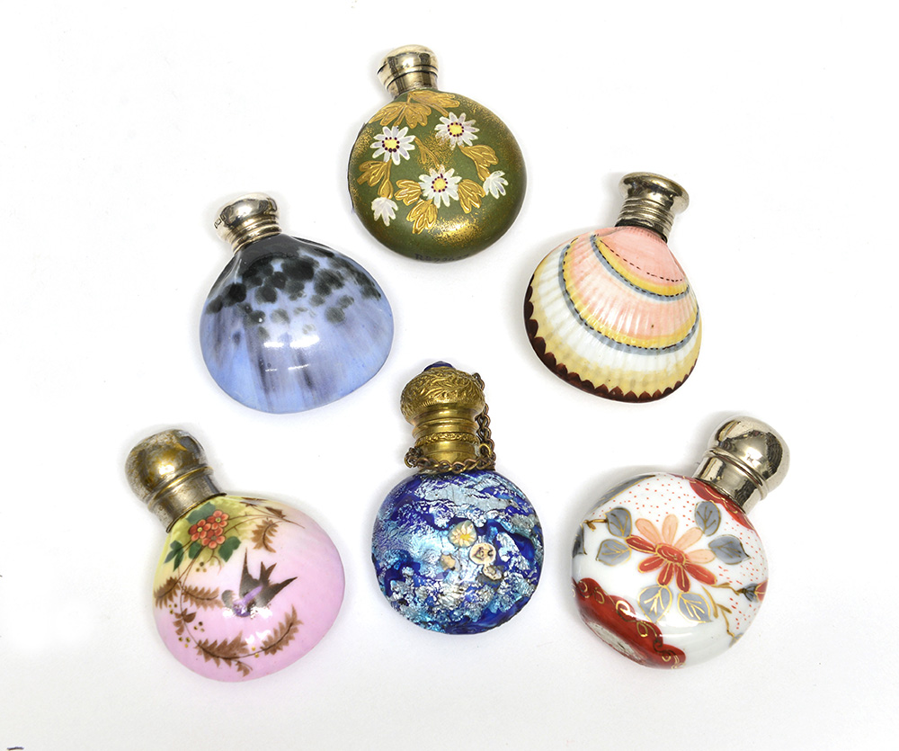 Lotto di sei boccette porta profumo in porcellana, ceramica e vetro di epoche diverse, con tappi in argento e metallo