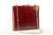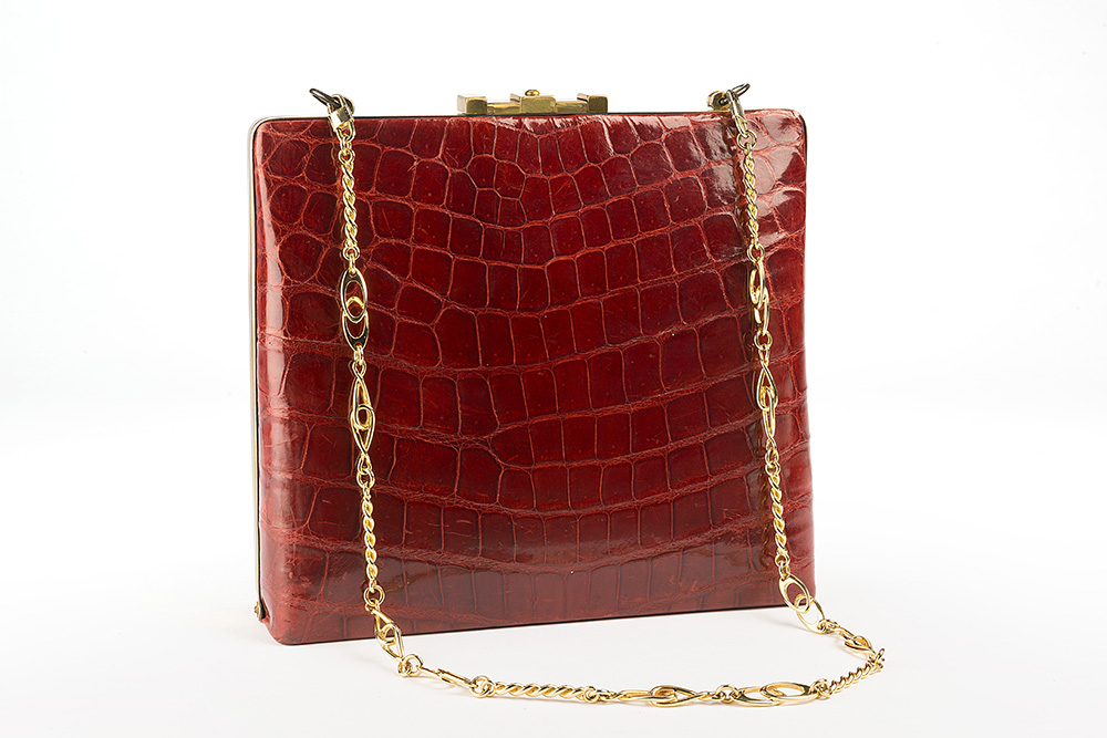 Borsa di forma a trapezio con tracolla in metallo color oro come la chiusura in pelle di coccodrillo color mattone, anni 55/60 (cm 26)