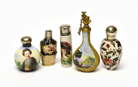 Manifattura del sec. XIX/XX. Lotto di cinque bottigliette portaprofumo in ceramica e porcellana decorate in policromia a figure femminili, fiori e paesaggi, alcune con ghiere in argento (difetti)