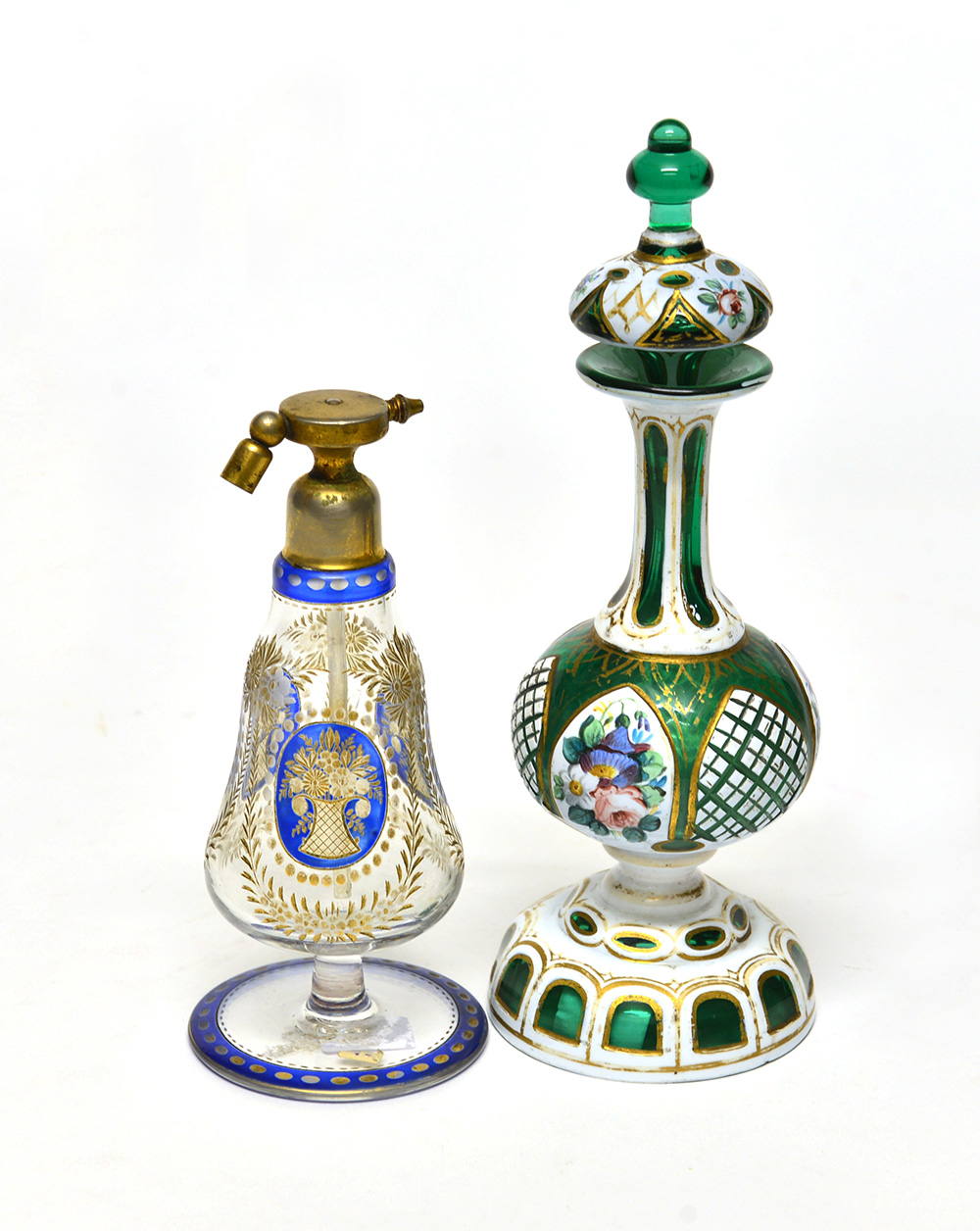 Manifattura di Boemia lotto composto da una bottiglia e un vaporizzatore in cristallo decorato all'acido e in policromia a fiori e vasi fioriti (h. cm. 12)