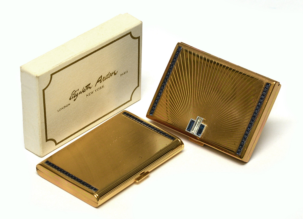 ELISABETH ARDEN ñ Lotto di due portacipria in metallo color oro, rifiniti con strass blu e e bianchi, uno con scatola originale ELISABETH ARDEN ñ Lotto di due portacipria in metallo color oro, rifiniti con strass blu e e bianchi, uno con scatola originale Lot comprising two compacts, one with original box