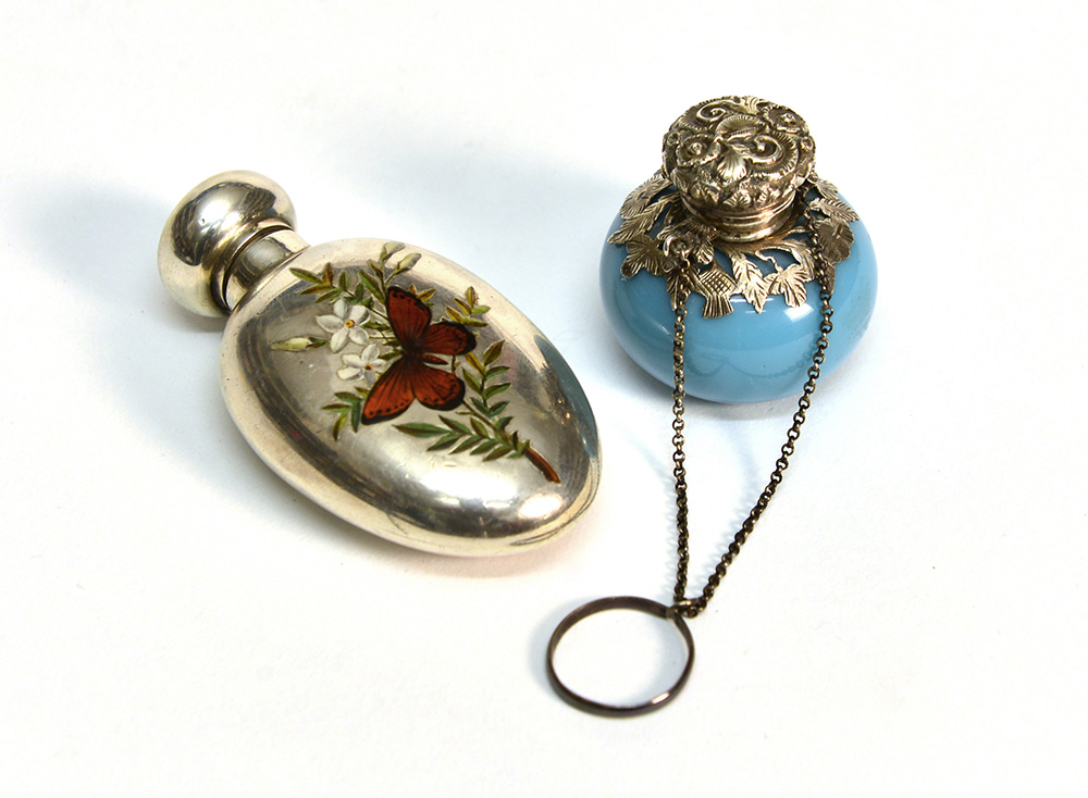 Lotto composto da due boccette porta profumo, una in argento decorata in policromia a farfalle e fiori e una in vetro con tappo e ghiera in argento traforato