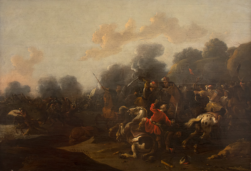 Lotto 13 | SCUOLA OLANDESE, XVII secolo. Scena di battaglia Olio su tavola, cm 57 x 83