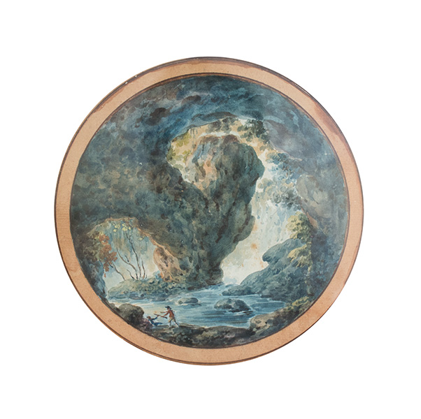 SCUOLA ROMANA, XVIII secolo. Le Cascate di Tivoli e La grotta di Nettuno a Tivoli Coppia di tempere su carta, circolari, diametro cm 19.