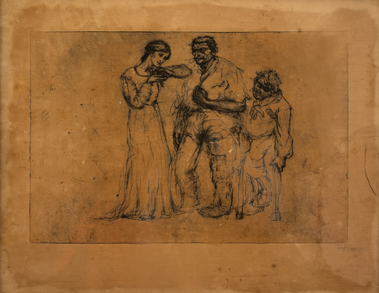 Lorenzo Gigli (Recanati 1896 – Buenos Aires 1983) Tre Figure, 1923. Acquaforte, 43 x 55 cm. Firmato e datato a matita. Pittore recanatese emigrato in Argentina nel 1913, espone al Salone Nazionale di Buenos Aires già nel 1919. Tornato in Europa, espone alla Quadriennale di Roma e, nel 1928 e poi nel 1930, alla XVI ed alla successiva XVII Biennale di Venezia.
