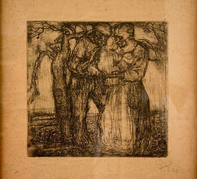 Lorenzo Gigli (Recanati 1896 – Buenos Aires 1983) Due Figure, 1921. Acquaforte, 41 x 35 cm. Firmato e datato a matita. Pittore recanatese emigrato in Argentina nel 1913, espone al Salone Nazionale di Buenos Aires già nel 1919. Tornato in Europa, espone alla Quadriennale di Roma e, nel 1928 e poi nel 1930, alla XVI ed alla successiva XVII Biennale di Venezia