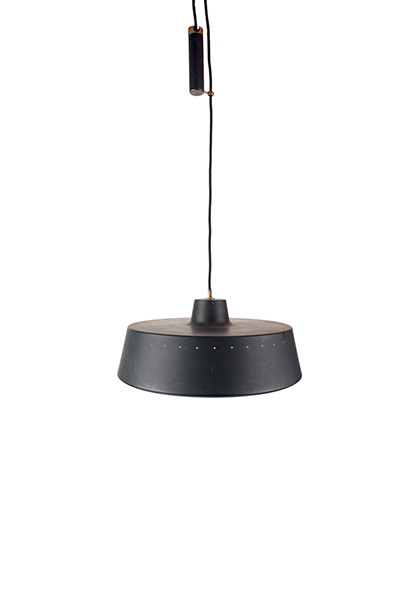 Lampadario saliscendi Lampada a sospensione a saliscendi in alluminio laccato nero e ottone, diametro diffusore dm circa 42. Produzione italiana anni ’50.