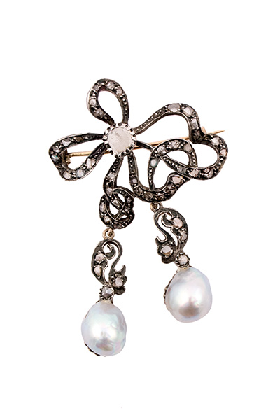 Spilla con diamanti rosa e due perle. gr. 14,50