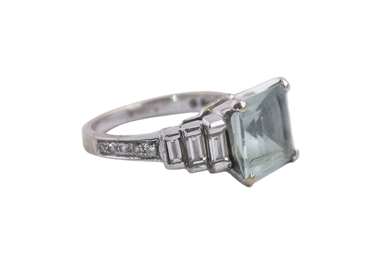 Anello con acquamarina e 6 baguettes. Montatura oro bianco 18 kti. Misura 9