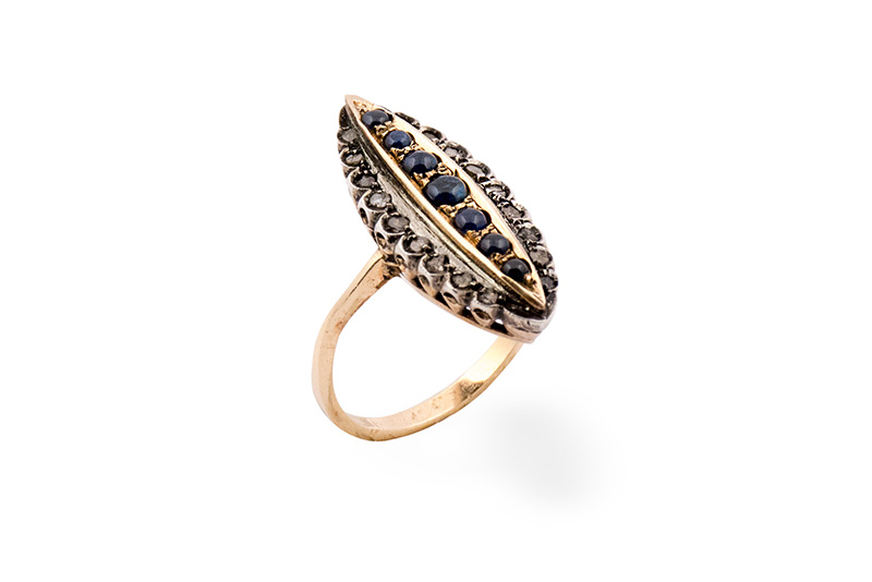 Anello con montatura marquise con zaffiri cabochon .7 zaffiri cabochon 19 diamanti taglio antico Peso gr. 4,73