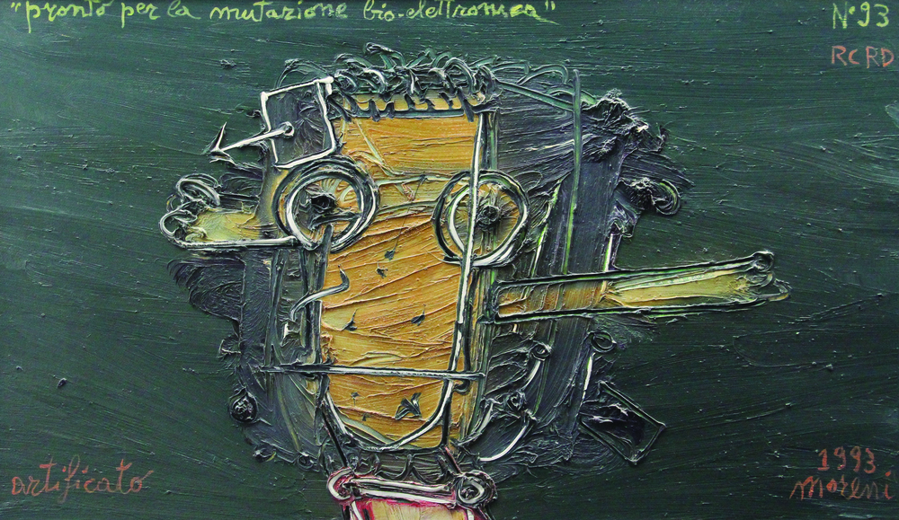 Mattia Moreni, Autoritratto N93 "Pronto per la mutazione bio-elettronica", 1998, olio su tela, cm. 70x120, firmato, intitolato e datato al fronte e al retro, opera pubblicata sul catalogo della mostra "Mattia Moreni", 1995, Galleria Il Vicolo, Cesena, p. 50, opera archiviata dall'Archivio Mattia Moreni con il numero 93/013, certificato di autenticità dell'artista su fotografia