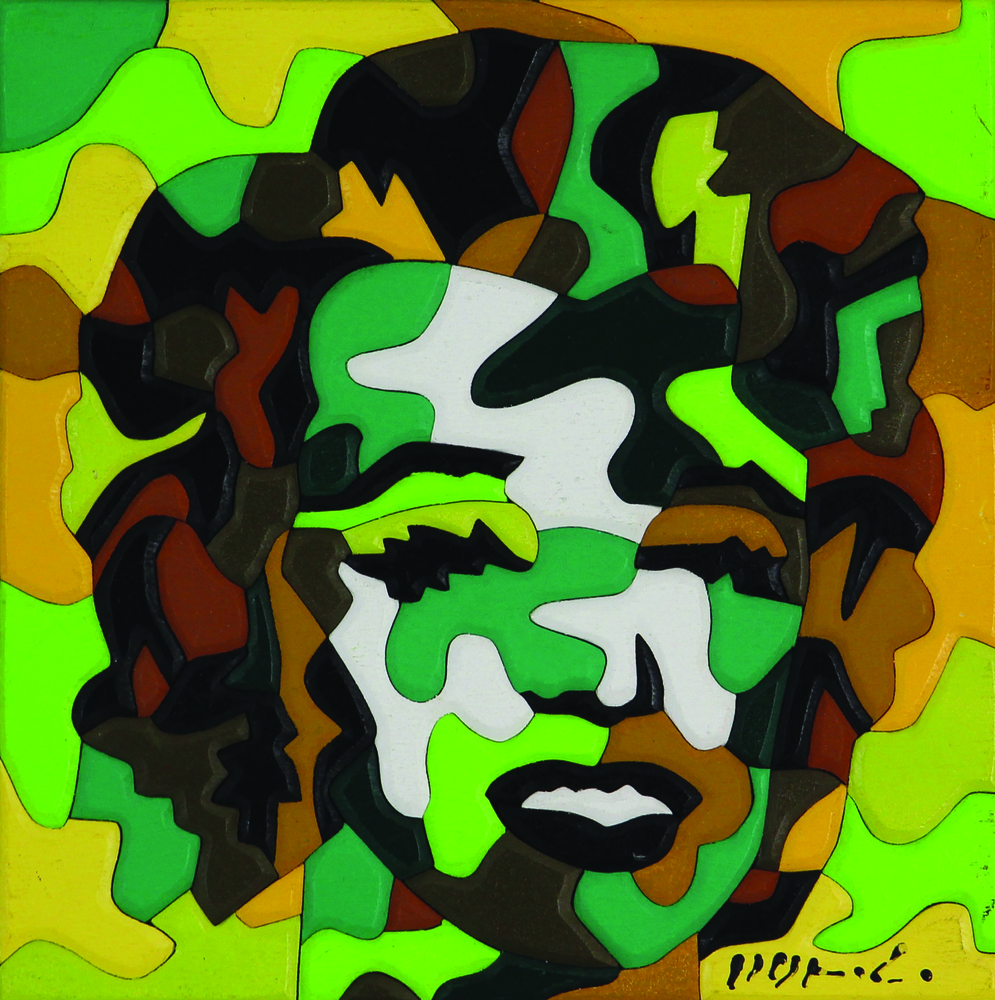 Ugo Nespolo, Mimetic, acrilico su legno intagliato, cm. 20x20, firmato in...