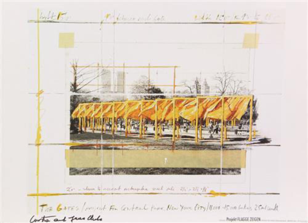 Christo & Jeanne-Claude, The Gates / Project for Central Park New York, stampa su cartoncino, cm. 60x84, firmata in basso a sinistra, l'opera presenta una stropicciatura nell'angolo in basso a sinistra, senza cornice