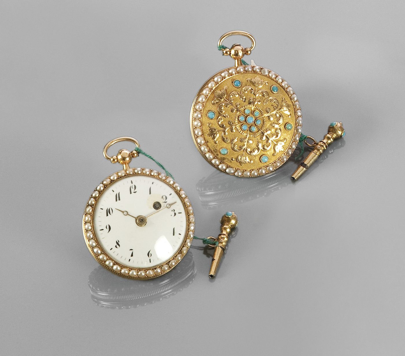 OROLOGIO DA TASCA Monachina anonima, metà XIXsecolo Diam. 36 Doppia cassa in oro giallo scanalata sui fianchi con motivi floreali e decori con turchesi sul dorso, piccole perle sui profili Quadrante in smalto con numerazione araba (difetto)