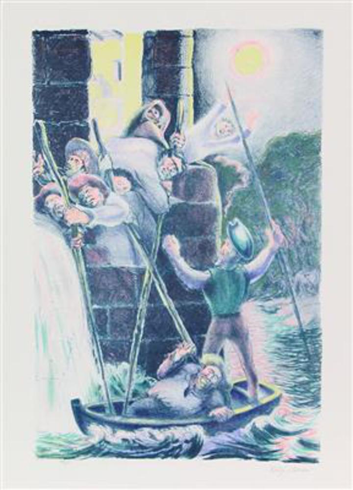 Aligi Sassu, Don Chisciotte della famosa avventura della barca,1985, litografia su carta, cm.70x50, es. 79/125, firmata in basso a destra, timbri a secco "Espolito Torino" in basso a sinistra e timbro a secco non decifrabile in basso a destra, sono presenti leggere stropicciature agli spigoli in alto e in basso a sinistra, senza cornice