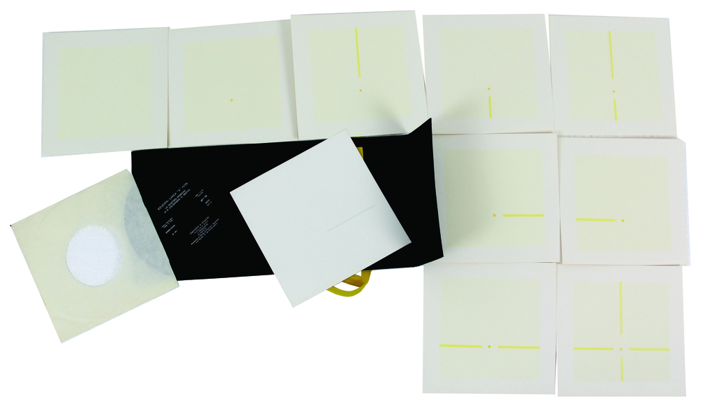 Antonio Calderara, Omaggio a Vivaldi, 1975, cofanetto in cartone telato che raccoglie 9 serigrafie e un vinile 45 giri "Le Quattro Stagioni di A. Calderara - E. Zaffiri", cm. 18,5x18,5, ogni serigrafia è firmata al retro