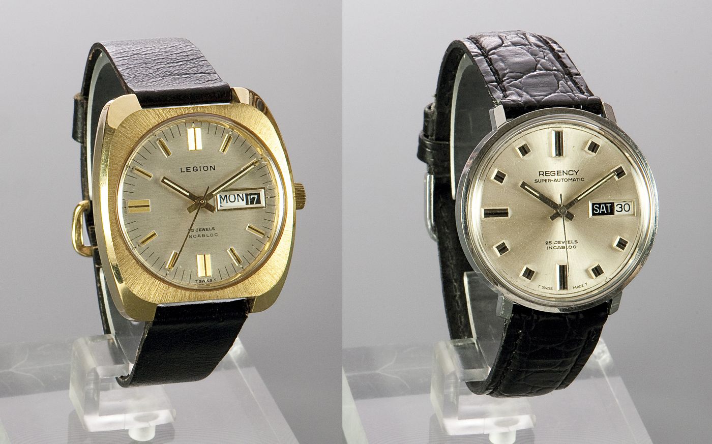 LOTTO DI DUE OROLOGI DA POLSO Lotto di due orologi da polso: il primo Regency, solo tempo Day Date, anni 70. Diam. 35. Cassa in acciaio in due parti; quadrante con indici geometrici applicati, indicazione giorno e data. Movimento automatico. Il secondo, Legion, solo tempo, Day Date, anni 70. Diam. 36.Cassa laminata oro, di forma carrè in due parti; quadrante con indici geometrici applicati, indicazione giorno e data. Movimento automatico.