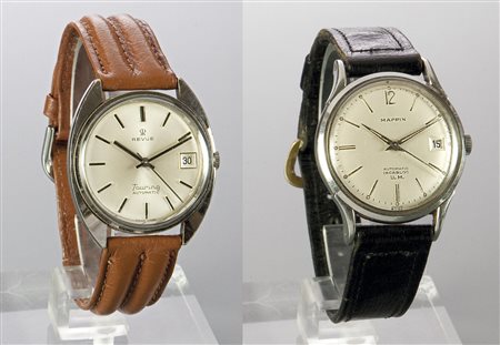 LOTTO DI DUE OROLOGI DA POLSO Lotto di due orologi da polso: il primo Mappin, solo tempo, anni '60 Diam. 35. Cassa in acciaio in due parti; quadrante con indici applicati. Movimento automatico. Il secondo: Revue, modelloTouring, solo tempo anni '70. Diam. 35. Cassa tonneu in acciaio con fondo a vite; quadrante con indici applicati Movimento automatico