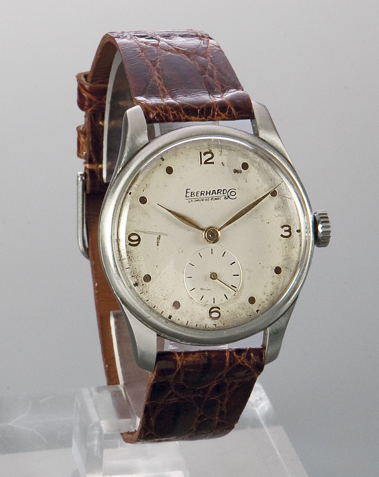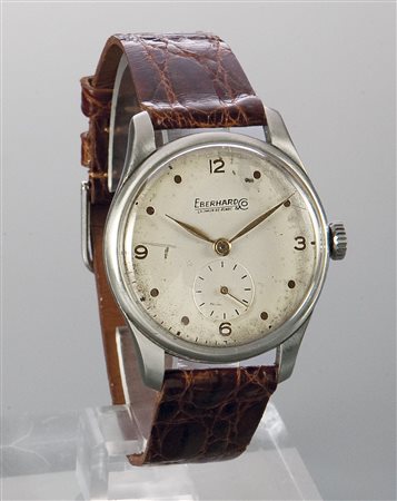 EBERHARD Solo tempo, anni '40 Diam. 34 Cassa in acciaio in due corpi; quadrante con numerazione araba ai quarti ed indici tondi alle ore; secondi al 6 Movimento a carica manuale