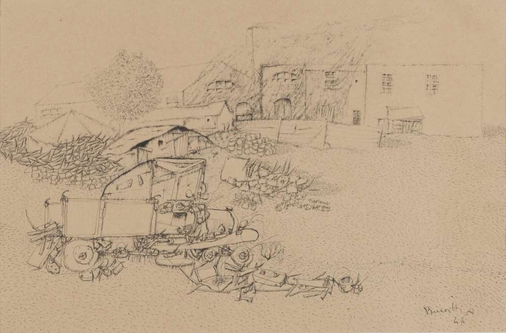 ARMANDO BURATTI (Roma 1924) Casolare, 1945 Fabbrica con rottame di macchina,...