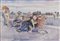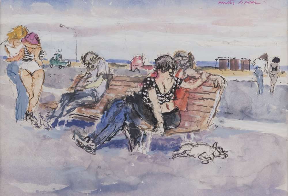 WALTER PIACESI (Ascoli Piceno 1929) Lungomare con passanti Tecnica mista su carta, cm. 25 x 36 Firma in alto a destra