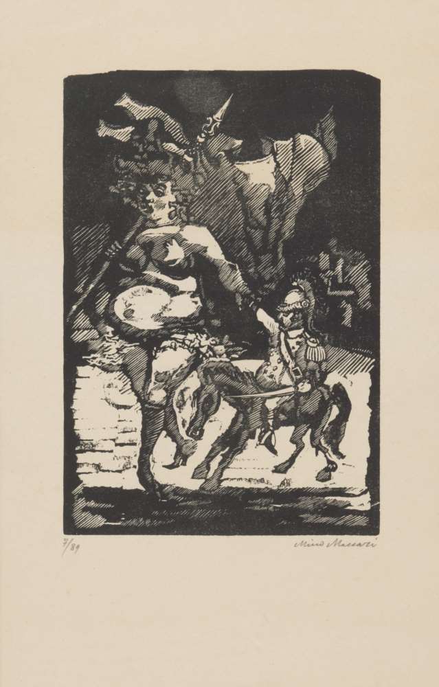 MINO MACCARI (Siena 1898 - Roma 1989) Donna e carabiniere a cavallo Linoleumgrafia, ex. 7/89 Misure della lastra, cm. 26 x 17,5 Firma in basso a destra