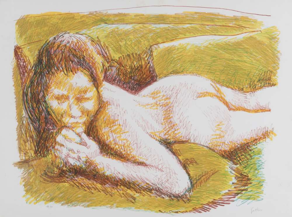 RENATO GUTTUSO (Bagheria 1912 - Roma 1987) Nudo sdraiato Litografia a colori, ex. 12/75 Misure del foglio, cm. 57 x 76 Firma in basso a destra