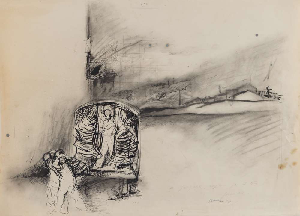 PIERO GUCCIONE (Scicli 1935) Macellai, 1957 China e carboncino su carta, cm....