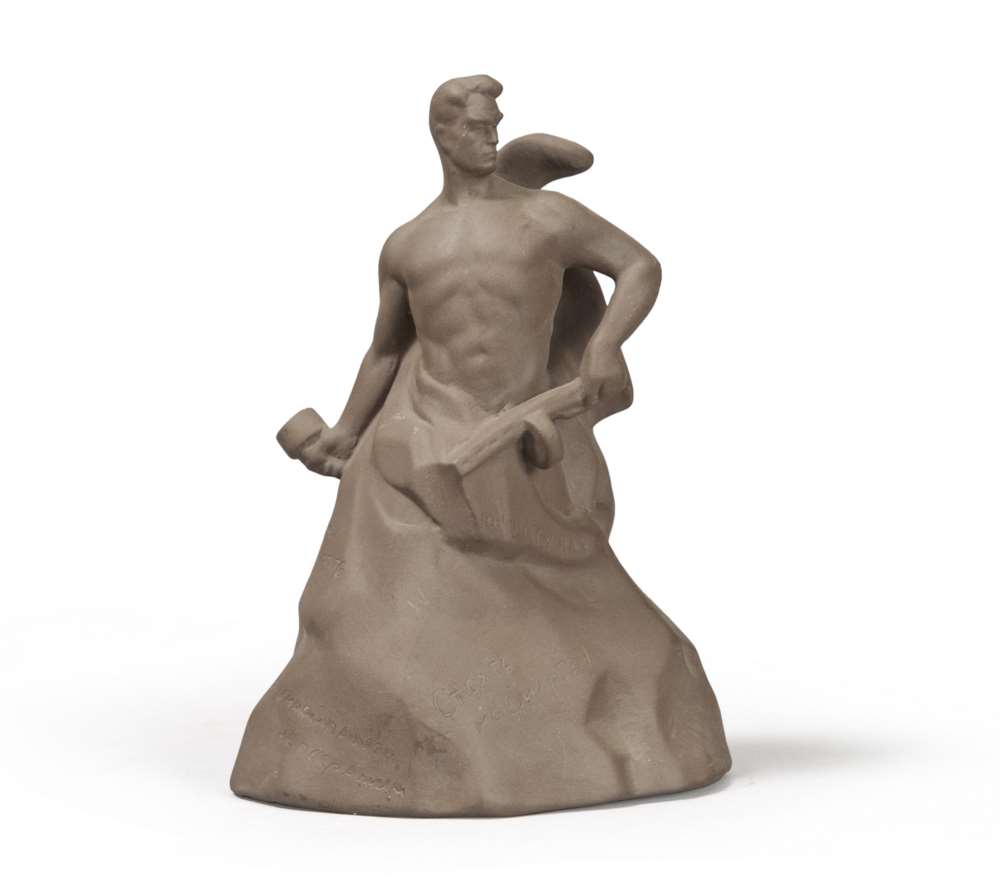 SCULTORE RUSSO XX SECOLO Lavoratore, anni '20 Terracotta dipinta, cm. 19,5 x 14 x 9,5 Iscrizioni e firma in lingua russa Le iscrizioni riportano frasi di incitamento ai soldati durante la Guerra